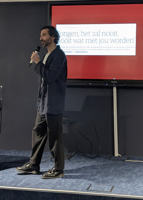 De uitspraak op de monitoren komt van cultureel antropoloog en schrijver Sinan Çankaya, die de themamiddag over diversiteit, inclusie en gelijkwaardigheid in Baarn opent. Met verhalen uit zijn eigen leven en uit de politiepraktijk probeert hij te bereiken dat zijn publiek zich ongemakkelijk gaat voelen. ‘Omdat ik geloof dat dit ongemak tot veranderingen of in elk geval tot beter nadenken kan leiden’, stelt hij. Daarom weeft hij bedreven verschillende anekdotes over zijn jeugd en uit zijn praktijk als onderzoeker aan elkaar. Vanuit die laatste rol is hij gepromoveerd op een onderzoek naar in- en uitsluiting van etnische minderheden binnen de politieorganisatie.
